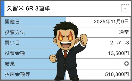 | 11月9日 | シルバークリア ナイト | 久留米5R | 久留米6R | 510,300円 |