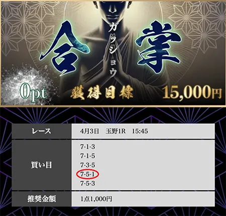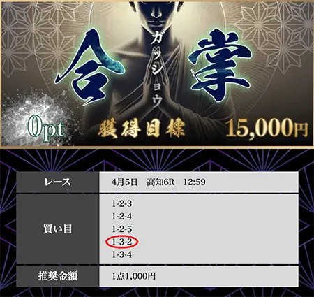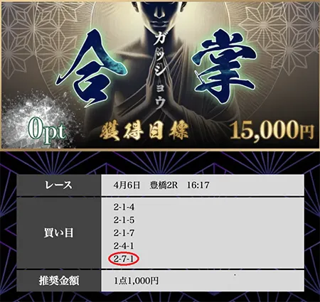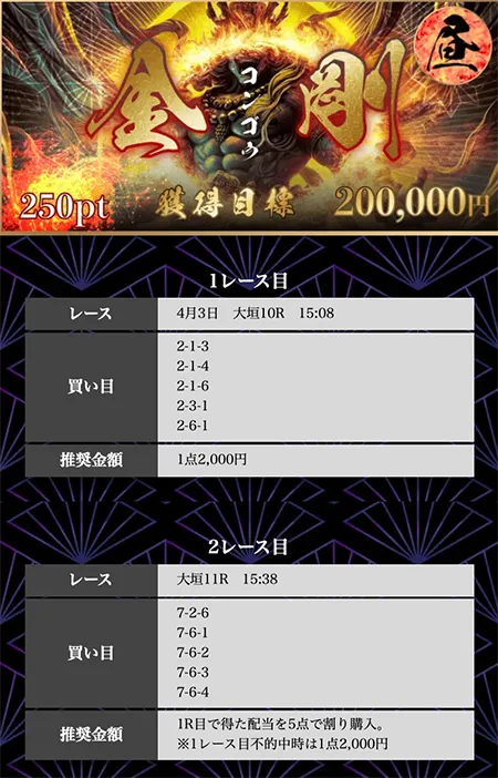 | 必要ポイント:250pt 提供レース :2レース 提 供 券 種 :3連単 参 加 締 切 :当日12:00 買い目公開 :当日13:00 買い目点数 :5点(1点2,000円) 獲 得 目 標 :200,000円 |