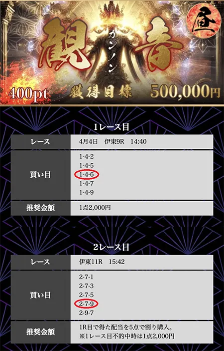 | 必要ポイント:400pt 提供レース :2レース 提 供 券 種 :3連単 参 加 締 切 :当日12:00 買い目公開 :当日13:00 買い目点数 :5点(1点2,000円) 獲 得 目 標 :500,000円 |