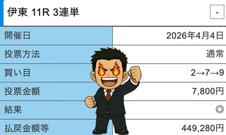 | 4月4日 | 観音 ーカンノンー 昼 | 伊東9R | 伊東11R | 449,280円 |