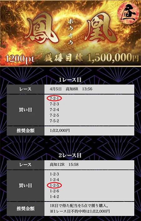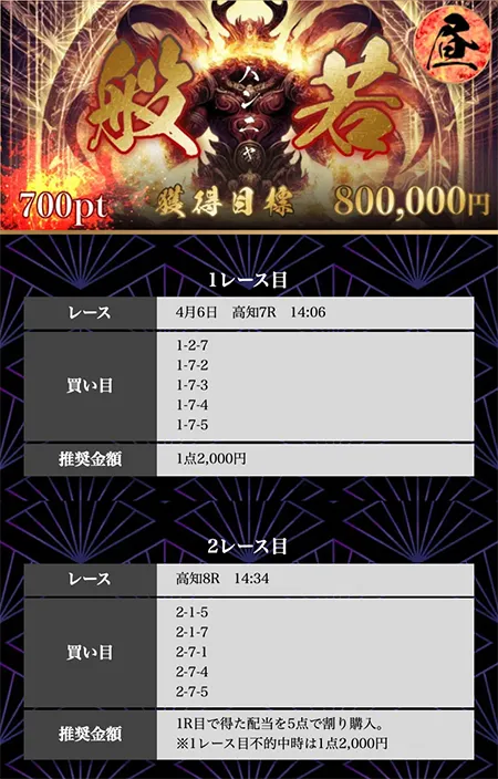 | 必要ポイント:1200pt 提供レース :2レース 提 供 券 種 :3連単 参 加 締 切 :当日12:00 買い目公開 :当日13:00 買い目点数 :5点(1点2,000円) 獲 得 目 標 :1,500,000円 |