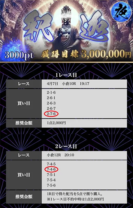 | 4月7日 | 釈迦 ーシャカー 夜 | 小倉10R | 小倉12R | 2,977,560円 |