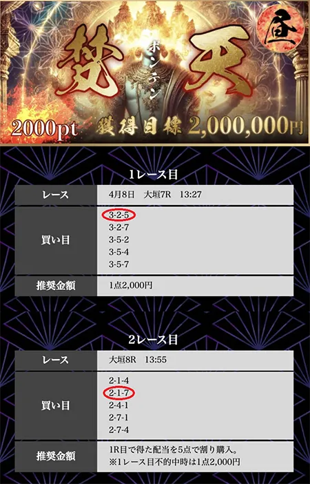 | 必要ポイント:2000pt 提供レース :2レース 提 供 券 種 :3連単 参 加 締 切 :当日12:00 買い目公開 :当日13:00 買い目点数 :5点(1点2,000円) 獲 得 目 標 :2,000,000円 |
